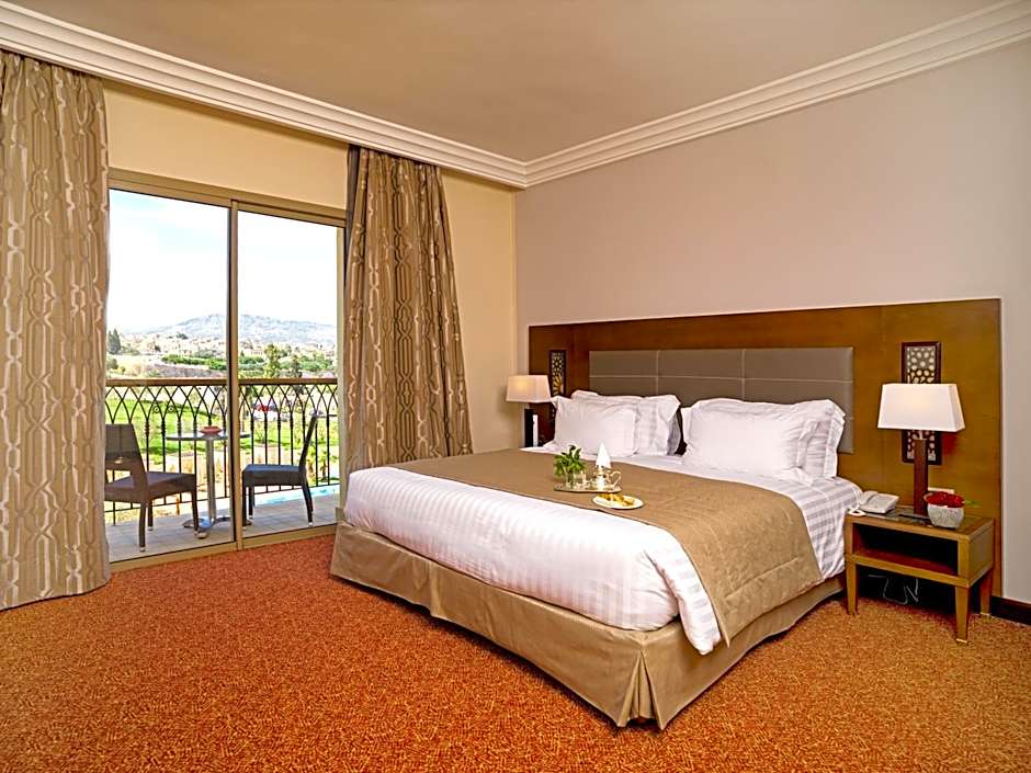 This spacious room has a private balcony with views of the pool and Medina. It features a seating area with a flat-screen TV.